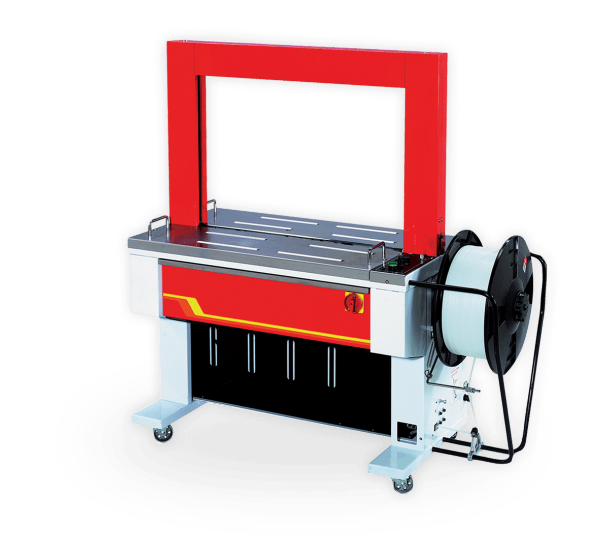 Ergonomique, elle dispose d’une bobine située à l’extérieur pour un chargement aisé et d’un système d’introduction automatique du feuillard. Montée sur roulettes avec freins, elle s’intègre et se déplace facilement